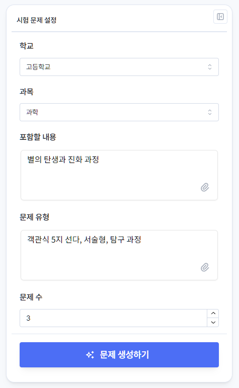 기출 문제, 학기 시험 문제, 쪽지 시험 문제 등으로 활용이 가능한 문제를 생성해보세요. 선생님이 원하는 조건들을 상세하게 설정하여 '나만의 시험지'를 만들 수 있어요
