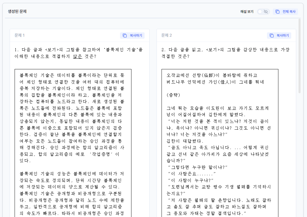 짠! 시험 문제 출제 기능으로 2025년 9월 국어 모의 평가의 지문을 기반으로 한 새로운 문제가 생성되었어요. 간단하죠? 이렇게 원래 있던 시험 문제 기반의 기출 문제 또한 제작이 가능해요.