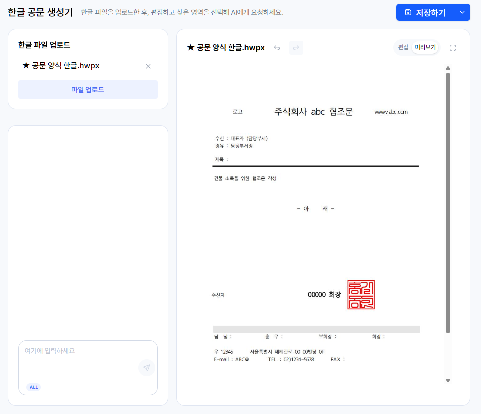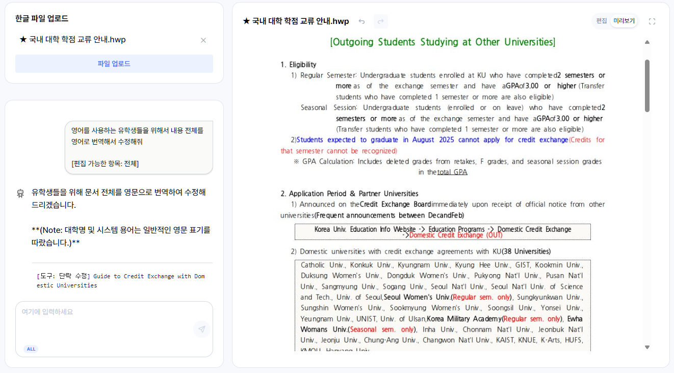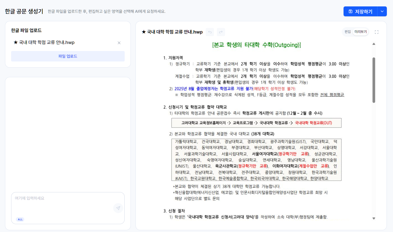 기존에 사용하던 한글(.hwp) 파일을 바로 업로드하여 편집할 수 있어요. AI의 도움을 받아 문서 내용을 수정할 수 있어요.