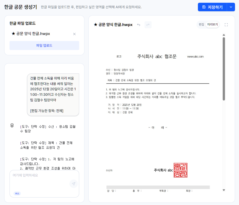 - AI 채팅을 통한 한글 파일 공문 수정: "이 문단의 어투를 공식적으로 바꿔줘", "결론 부분에 '상호 협력'에 대한 내용을 추가해 줘"와 같이 요청하면 AI가 즉시 반영해요.